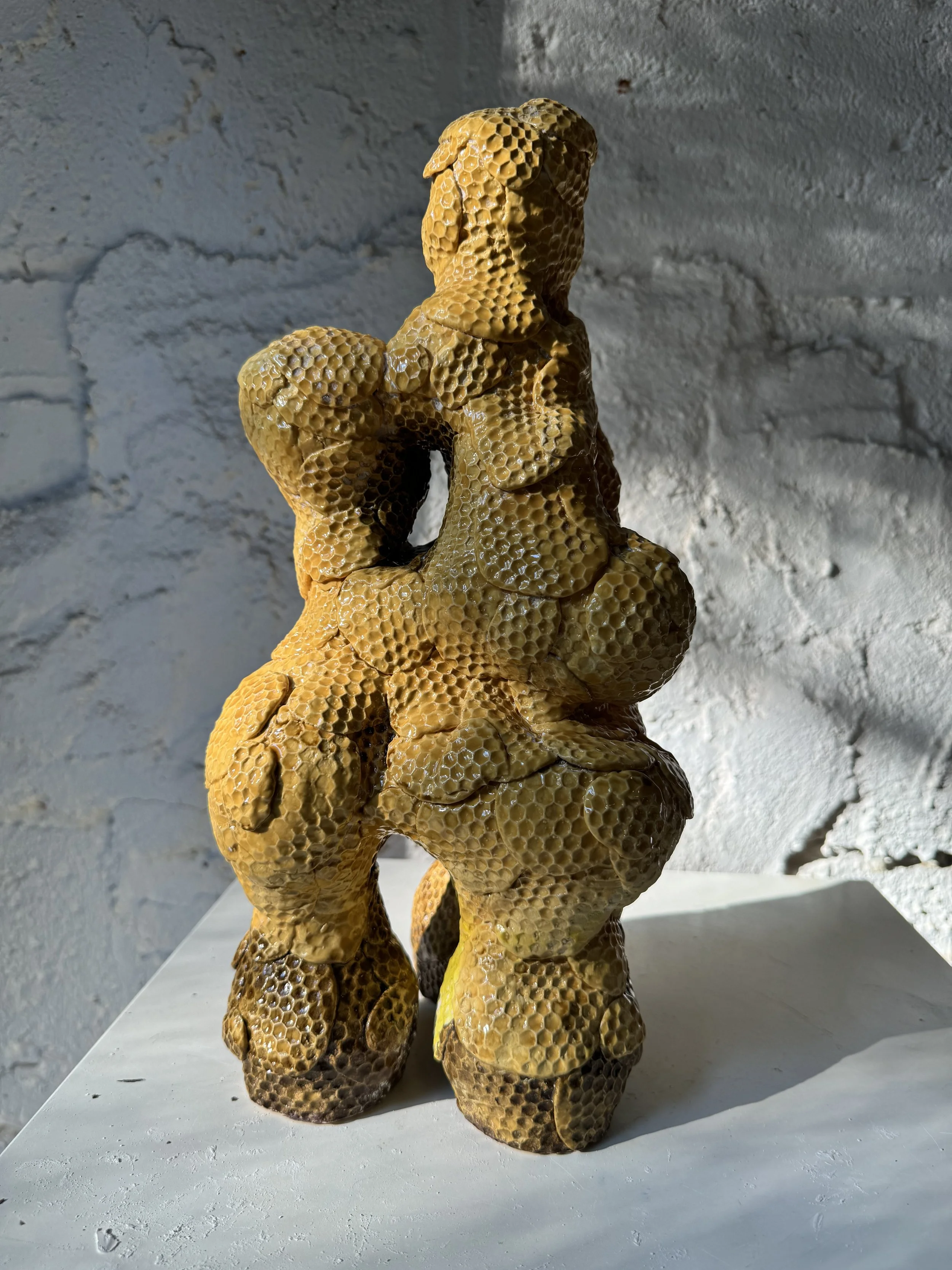 The shape of the sculpture resembles the complex structure of a wild bee hive. The texture at work is the imprint of a honeycomb.