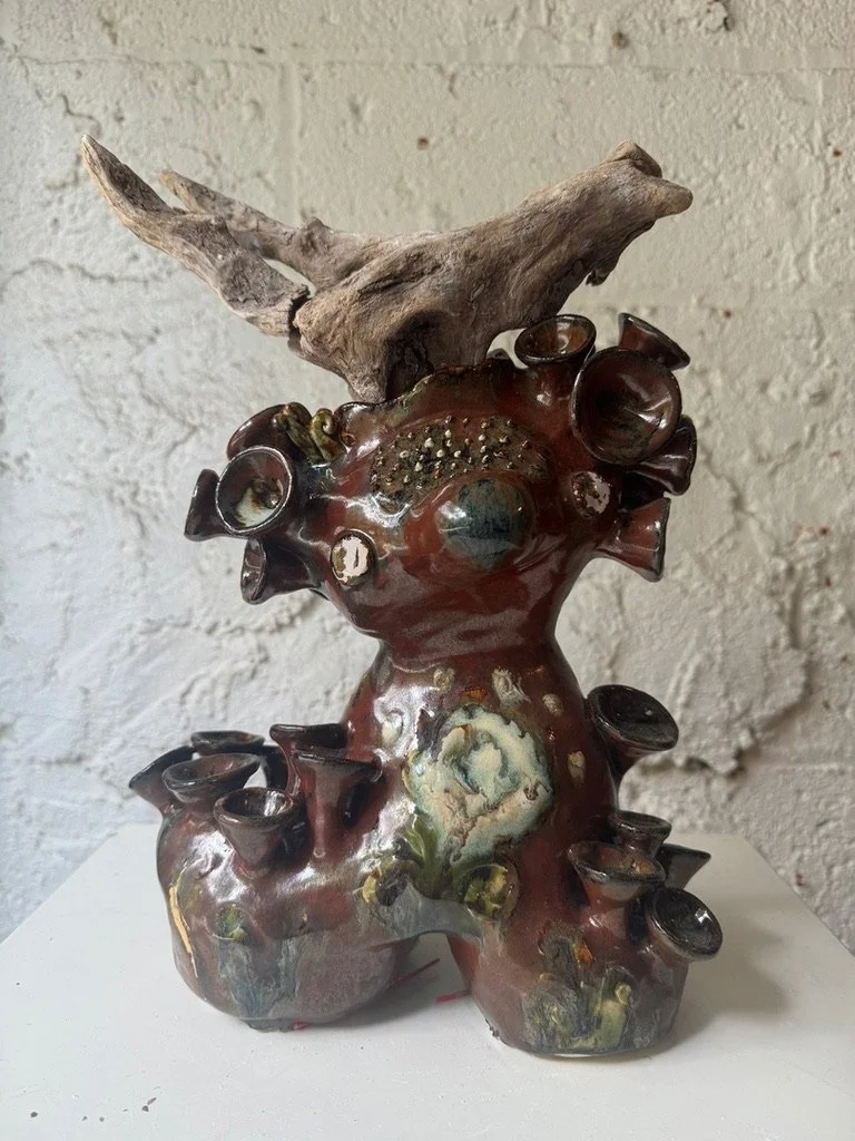 Ceramic 9” x 5” x 13” Red clay, glazes, driftwood 2024