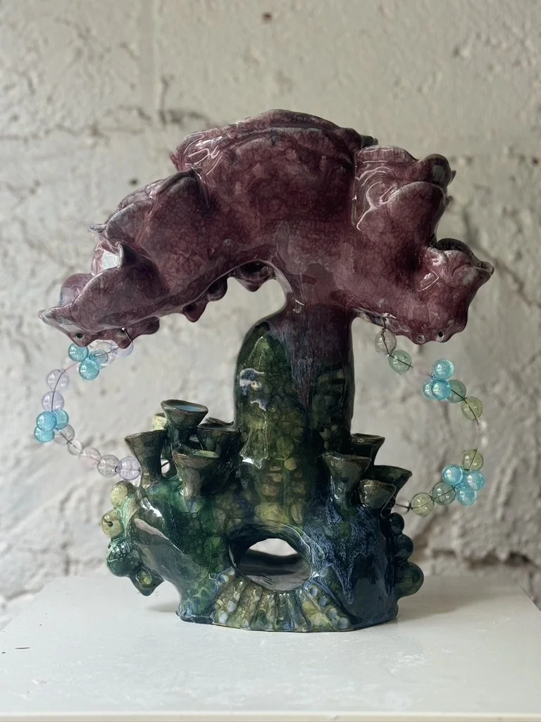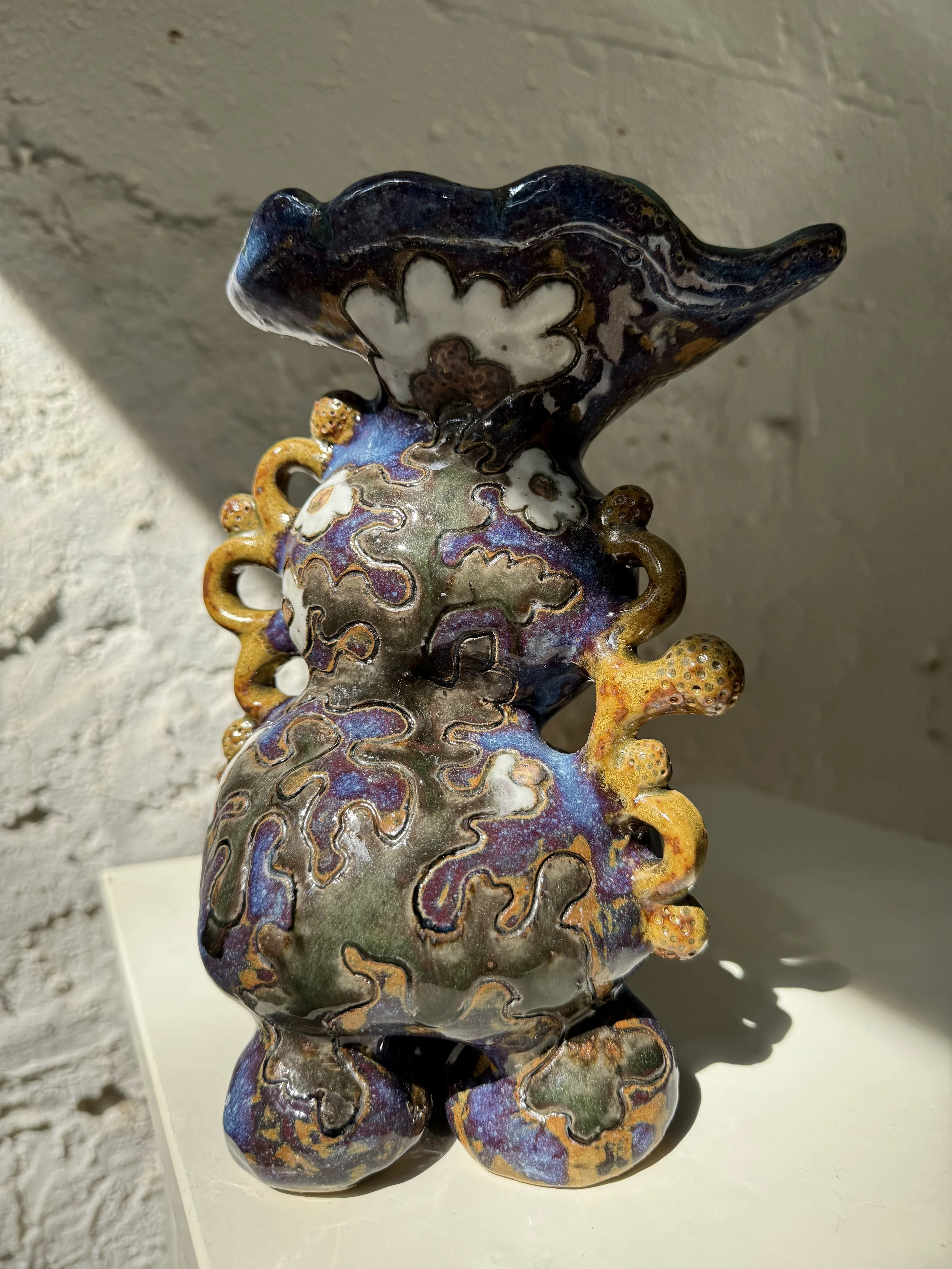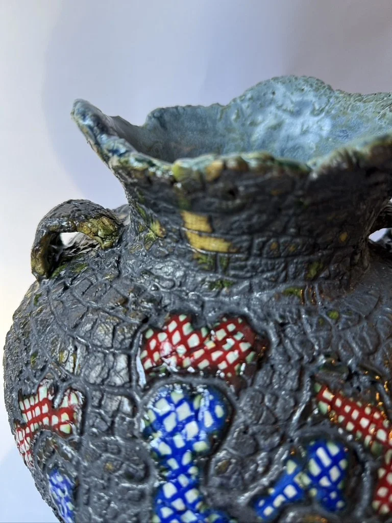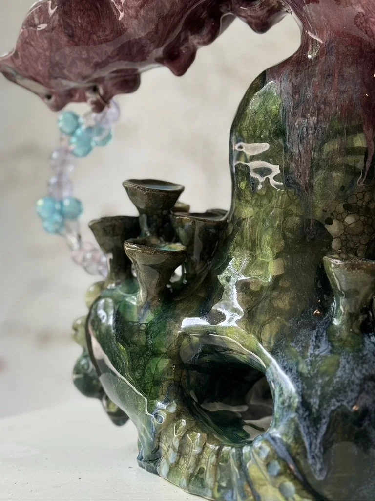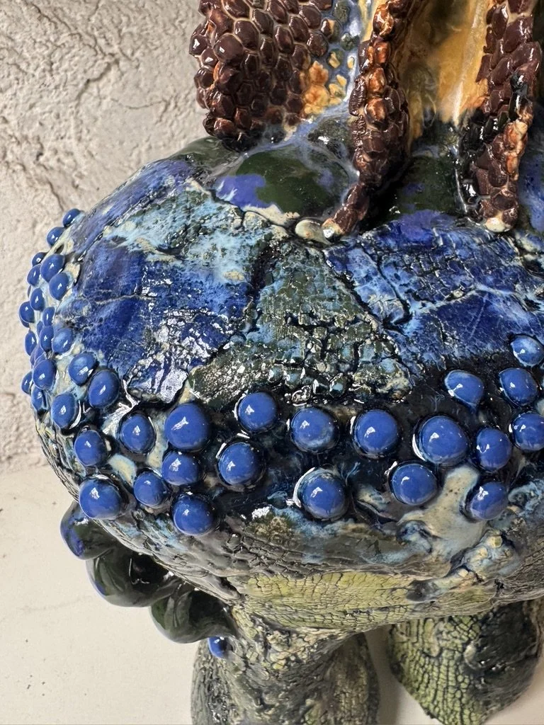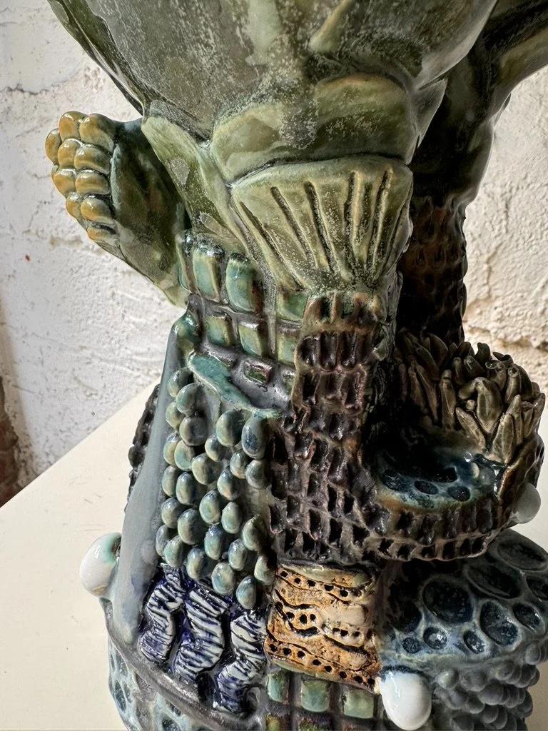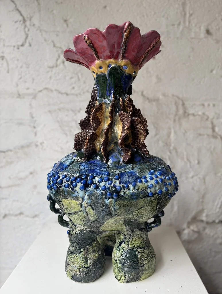 Ceramic 9” x 8” x 13” Red clay, underglaze, glazes, copper oxide 2025